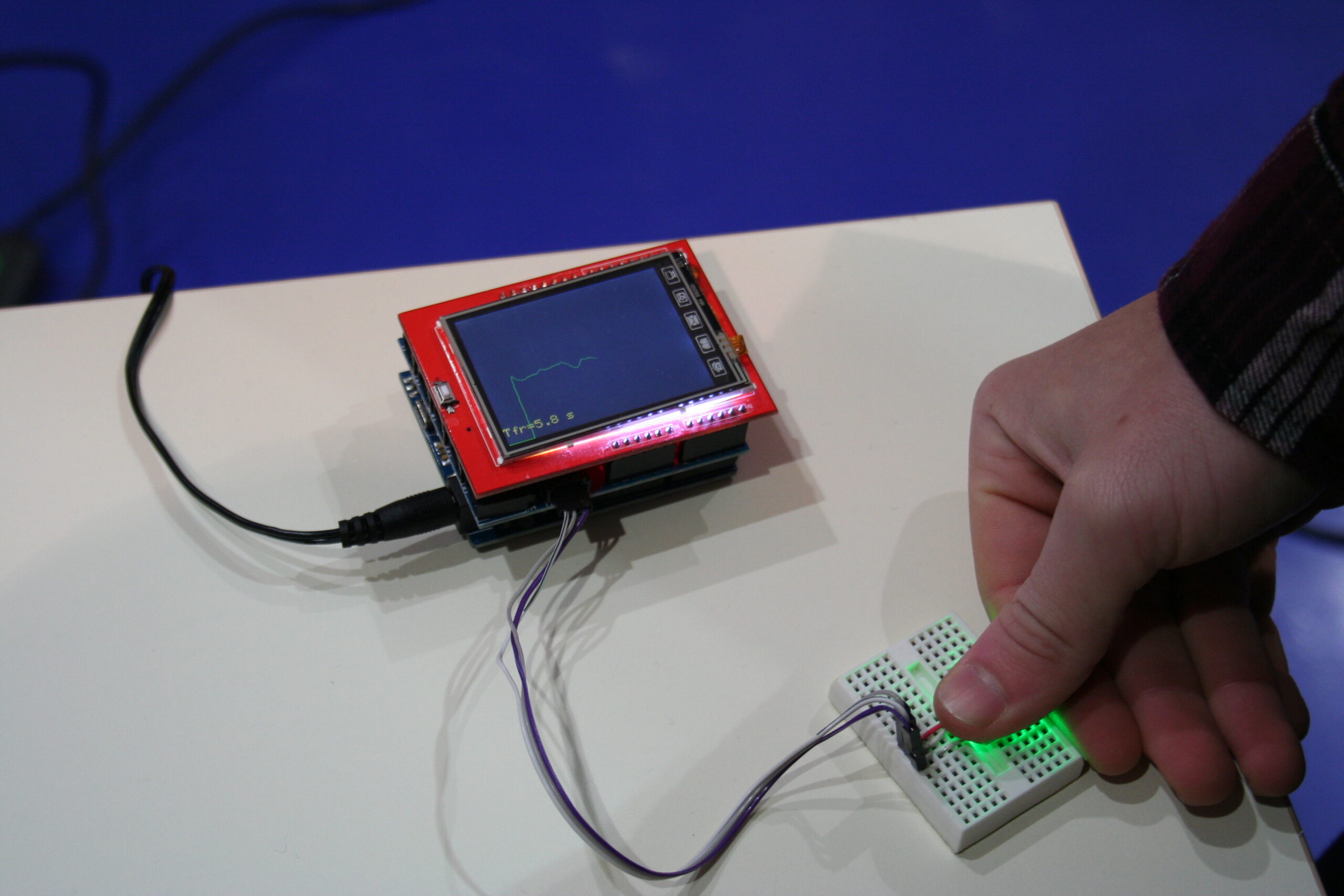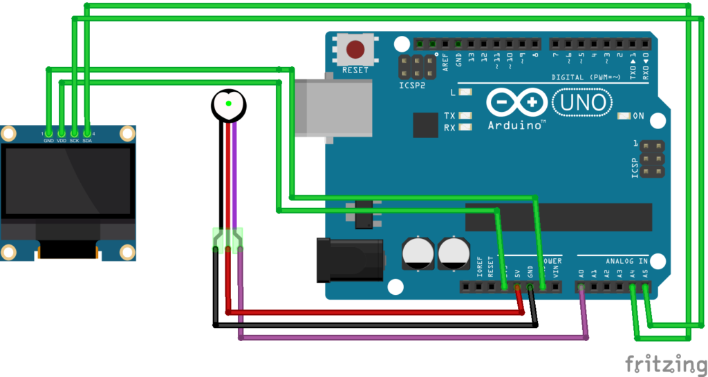 Il sensore per il rilevamento del battito cardiaco, opportunamente collegato alla breadboard, inizia automaticamente la misurazione dei parametri cardiaci nel momento in cui viene rilevata la presenza di una delle dita della mano. I dati, inviati alla scheda Arduino, vengono poi elaborati e visualizzati sul display sotto forma di grafico (riconducibile al comune elettrocardiogramma).