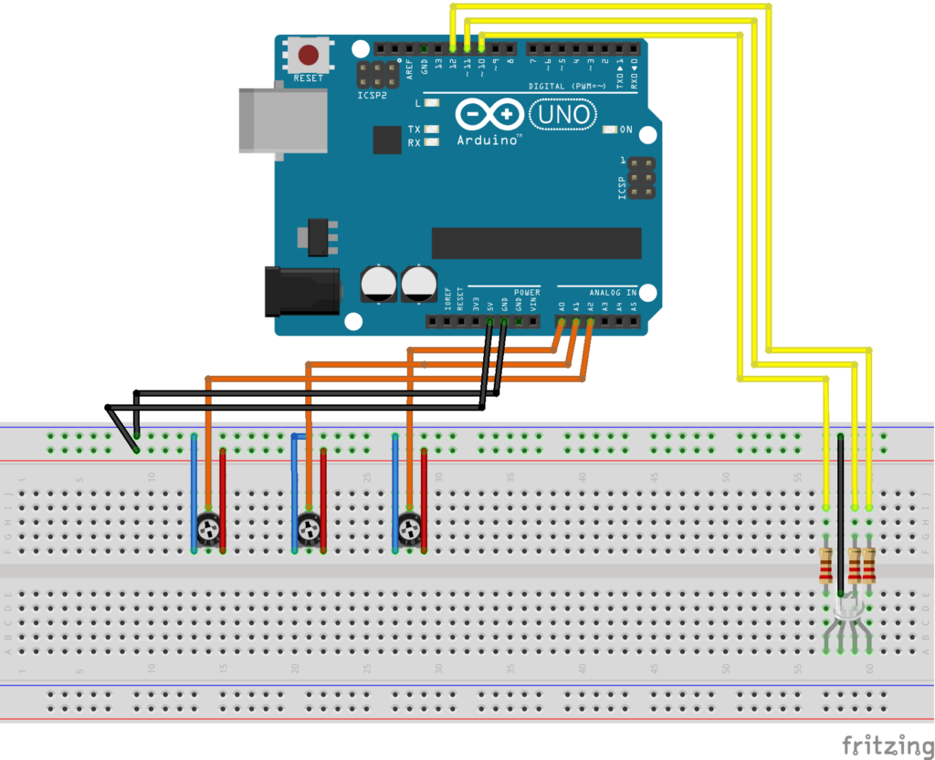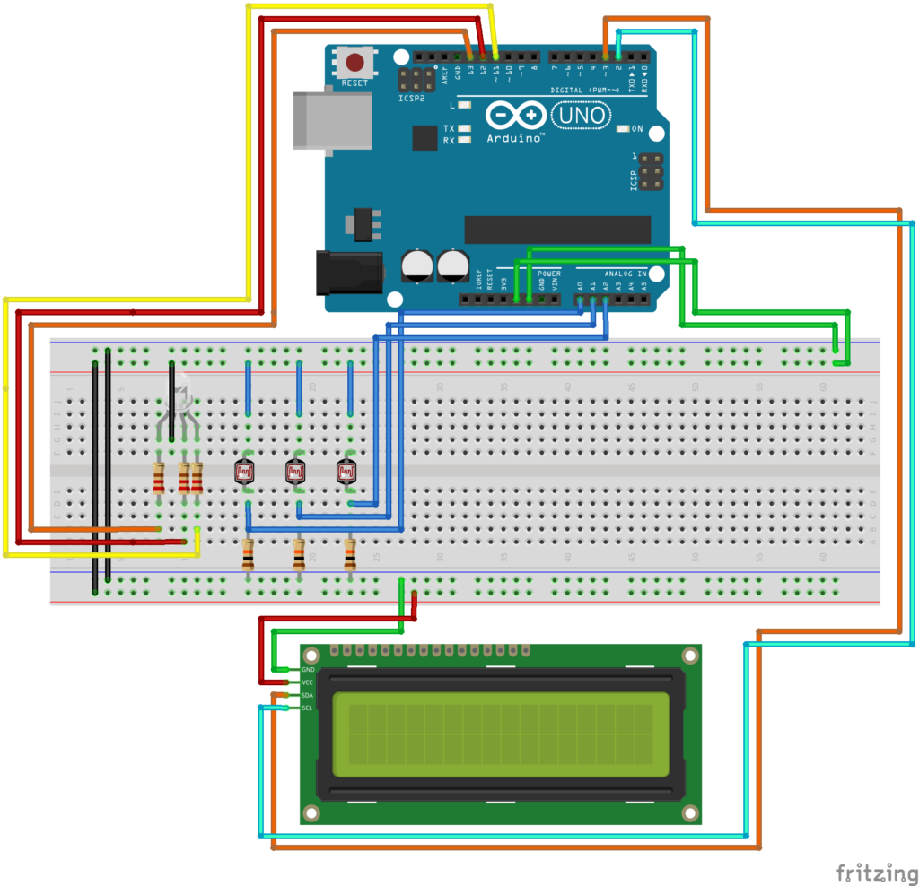 Si esamina la variazione dei colori del led RGB in relazione alla luce che arriva alle fotoresistenza coperte da filtri rispettivamente blu, rosso e verde. Si noti la diminuzione o l’aumento delle quantità di colore sul display in base alla variazione di luce. Inoltre è possibile riscontrare il funzionamento di un led RGB, e dunque osservare la variazione dei 3 colori grazie all’utilizzo di più potenziometri.