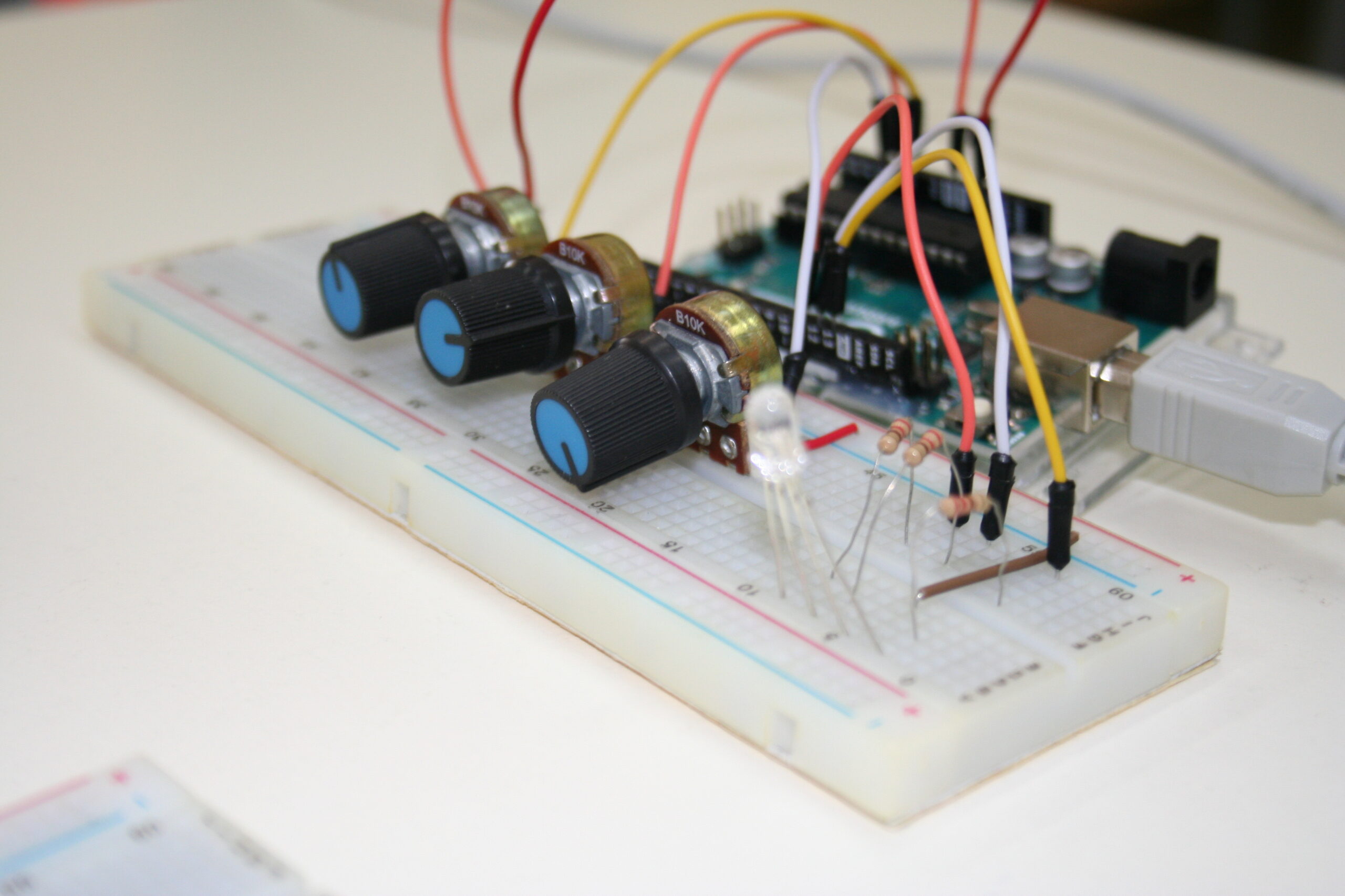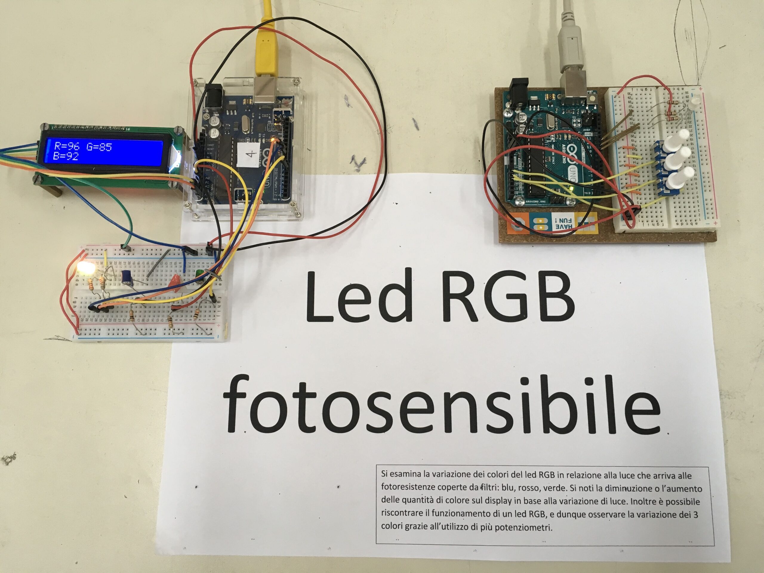 Si esamina la variazione dei colori del led RGB in relazione alla luce che arriva alle fotoresistenza coperte da filtri rispettivamente blu, rosso e verde. Si noti la diminuzione o l’aumento delle quantità di colore sul display in base alla variazione di luce. Inoltre è possibile riscontrare il funzionamento di un led RGB, e dunque osservare la variazione dei 3 colori grazie all’utilizzo di più potenziometri.