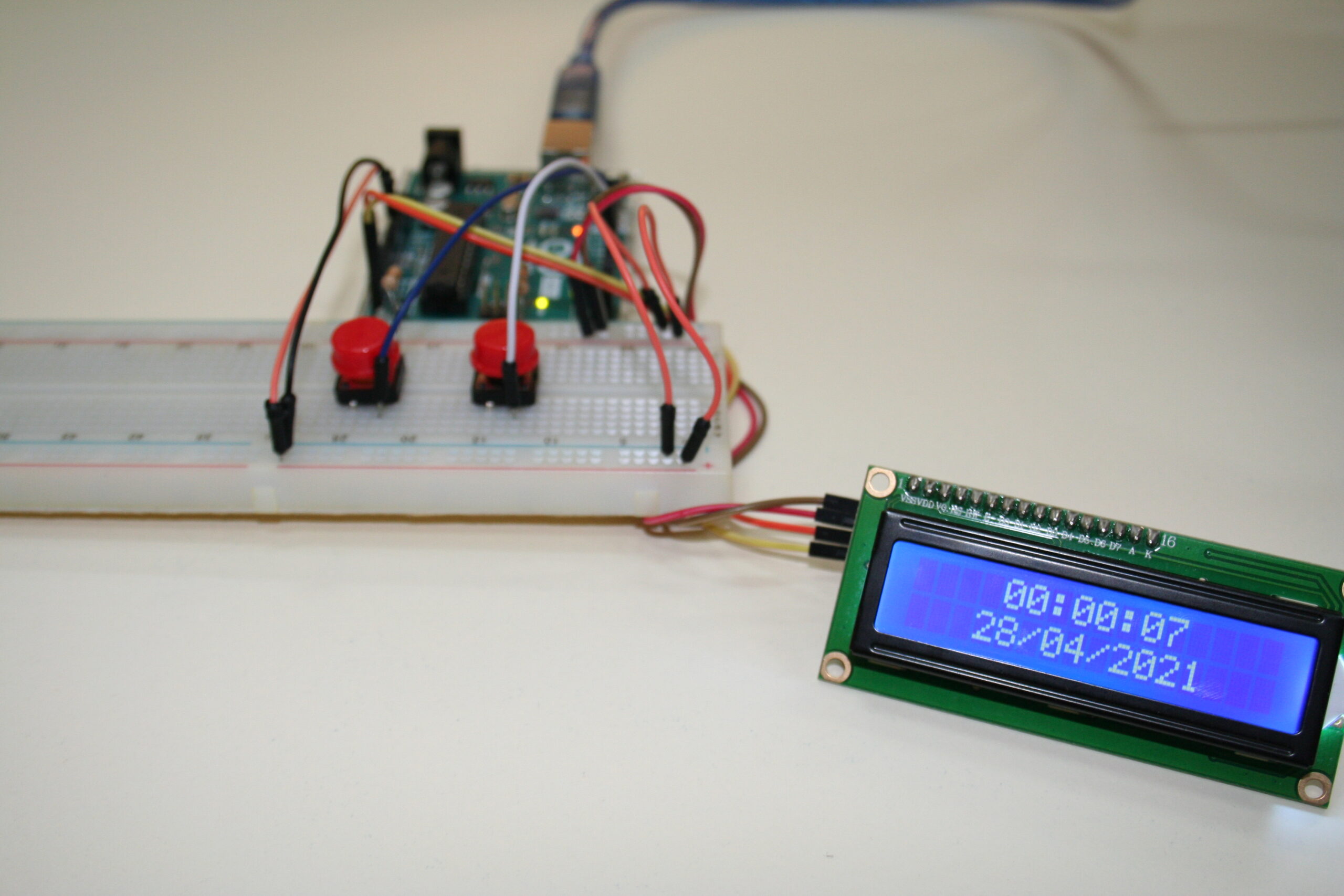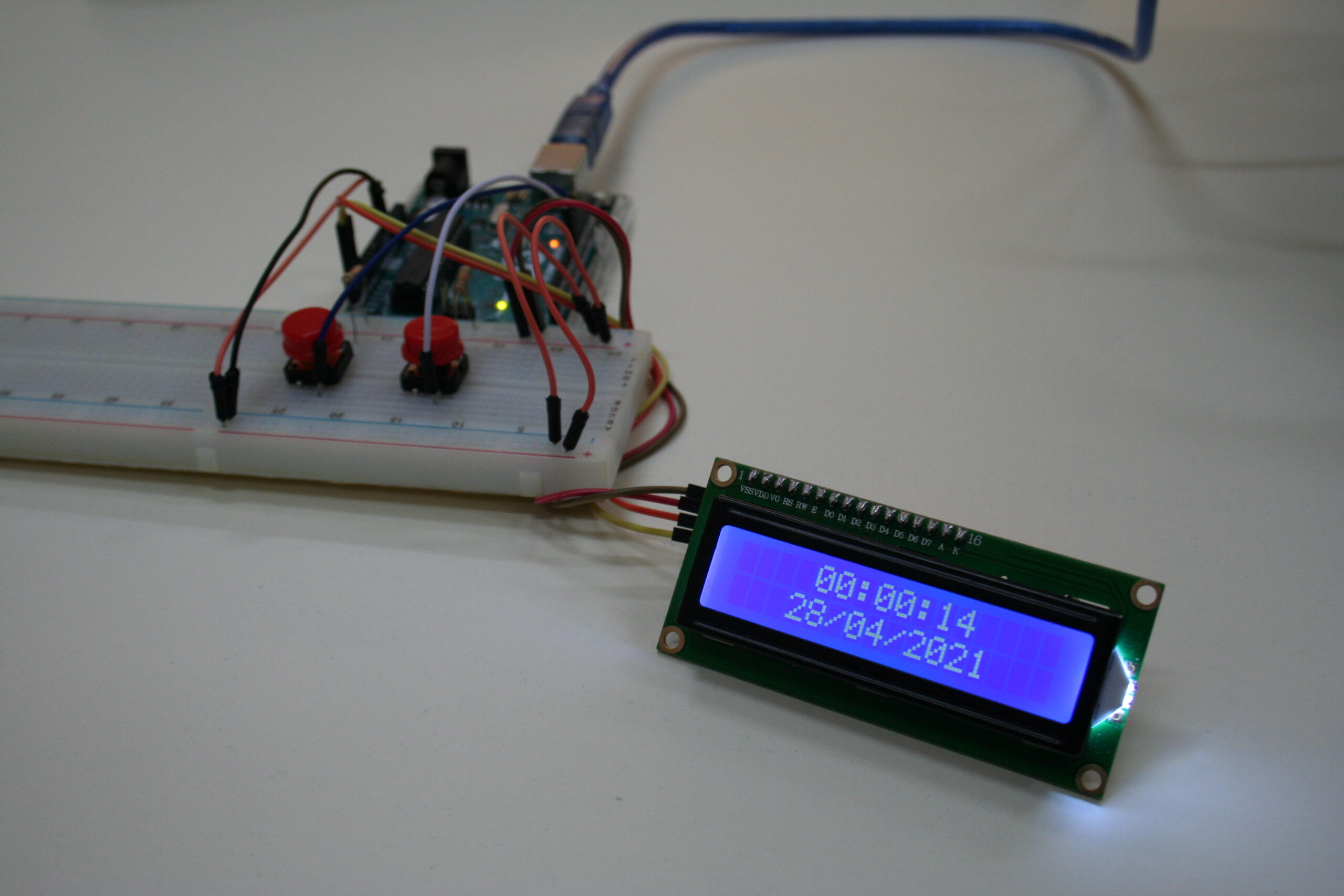 È stata emulata, nel codice in C, la logica di funzionamento dei comuni orologi digitali. Sul Display LCD viene visualizzata, grazie all’algoritmo caricato all’interno della memoria della scheda Arduino, l’ora (hh:mm:ss) e la data (gg/mm/aaaa). È inoltre possibile, sfruttando i pulsanti presenti sulla breadboard, impostare l’ora che la data corretti.