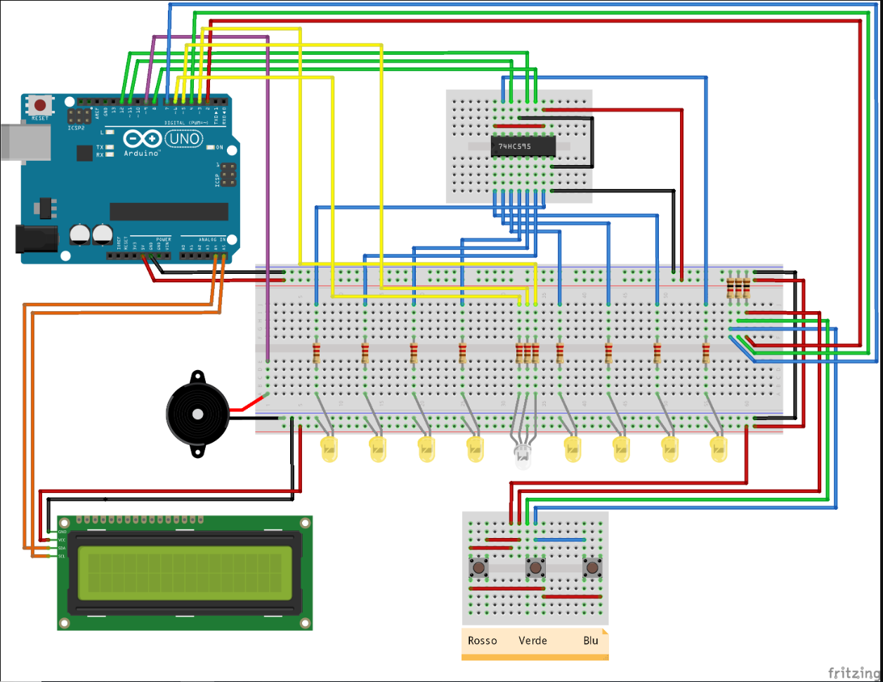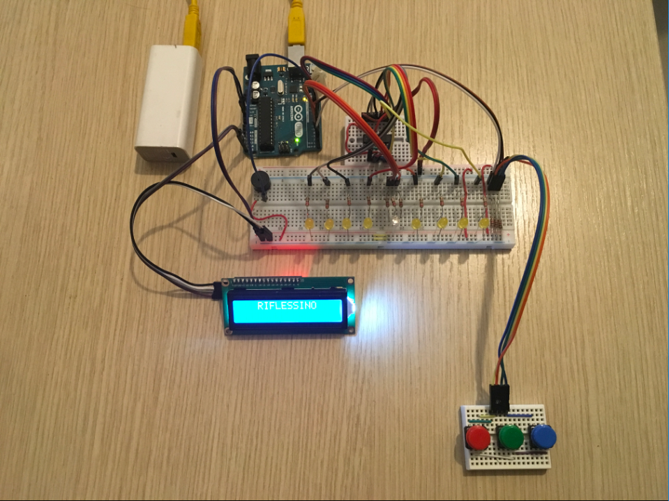 Il progetto è un gioco, utile per testare i riflessi di un individuo attraverso un led RGB, collegato a 3 pulsanti di diverso colore. In base al colore generato dal led (casuale), il giocatore deve premere il pulsante corretto in tempo, ciò implica un incremento del punteggio; nel caso in cui venga premuto un pulsante con colore differente da quello del led, verranno sottratti dei punti. Inoltre ci sono dei led monocromatici che precedono e seguono il led RGB centrale; questi si illuminano e si spengono a velocità sempre crescente. La difficoltà è proprio nel premere il pulsante giusto in tempo. Il gioco finisce una volta superato il limite di tempo prefissato. Inoltre è possibile scegliere quanti colori il led RGB debba generare (un minimo di 1 e un massimo di 3).